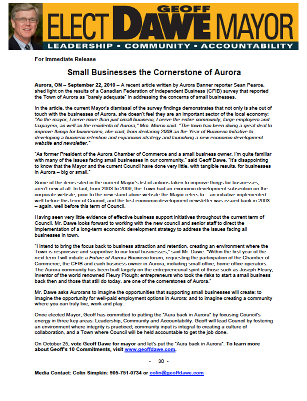 Geoff Dawe for Mayor CAMPAIGN HOTLINE: 905-751-0734 • EMAIL: